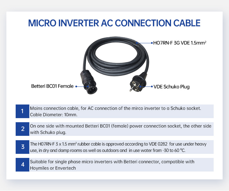 Mains connection cable, for AC connection of the module inverter to a Schuko socket. Cable Diameter: 10mm